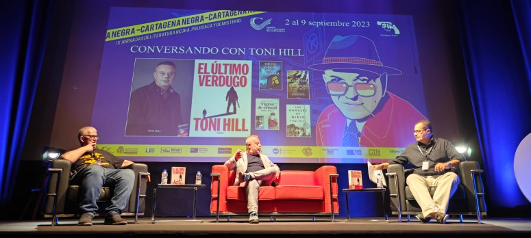 Toni Hill, es un escritor y traductor. Autor de tres novelas policíacas protagonizadas por el inspector Héctor Salgado: El verano de los juguetes muertos, Los buenos suicidas y Los amantes de Hiroshima; y de la novela de misterio de ambientación gótica Los ángeles de hielo. También ha escrito el thriller moderno Tigres de cristal. Ya había estado en otra de las ediciones de Cartagena Negra y hoy ha vuelto para presentar su útlima obra El último verdugo.