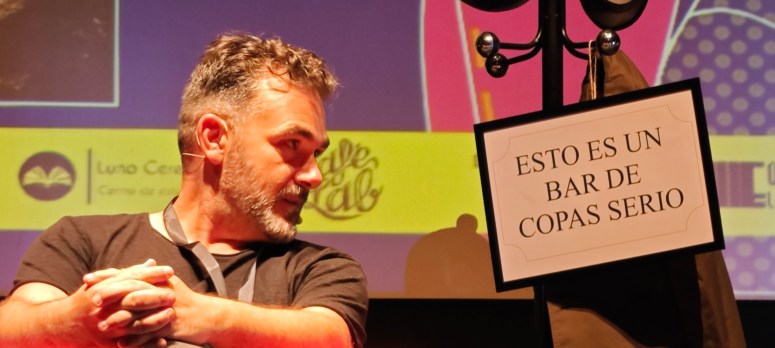 De repente Manuel Acosta hizo una llamada y entró un camarero con botella y dos vasos, cambiando de escenario al Bublé «Esto es un bar de copas serio»; a la vez que preguntó al invitado por su personaje Samael. Un reto presentar a un malo malísimo al principio de la novela y conseguir que el lector se enganche.